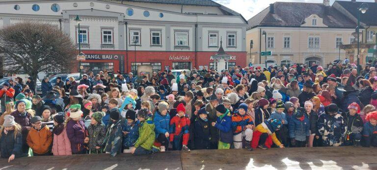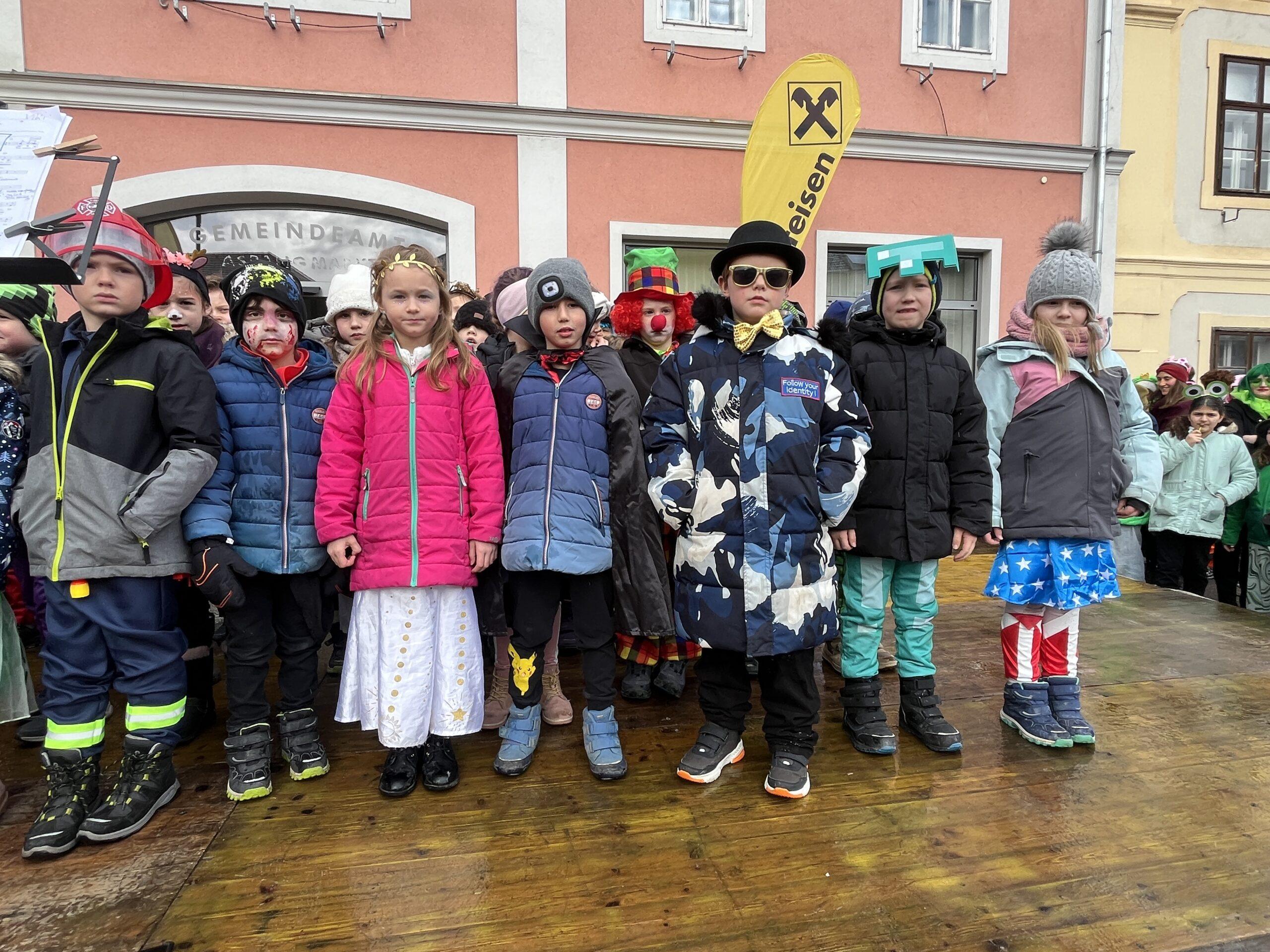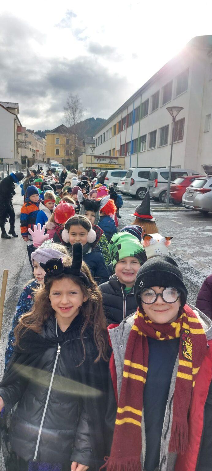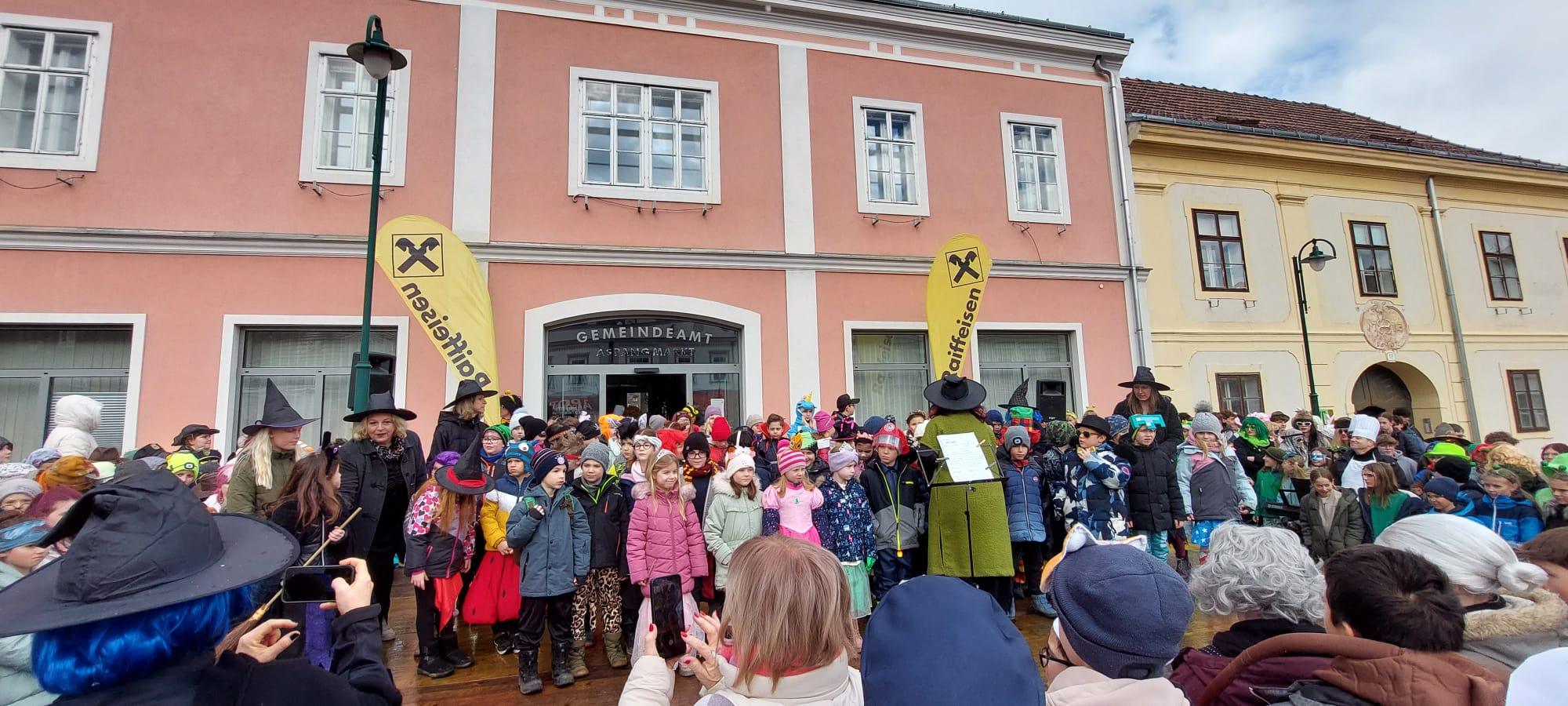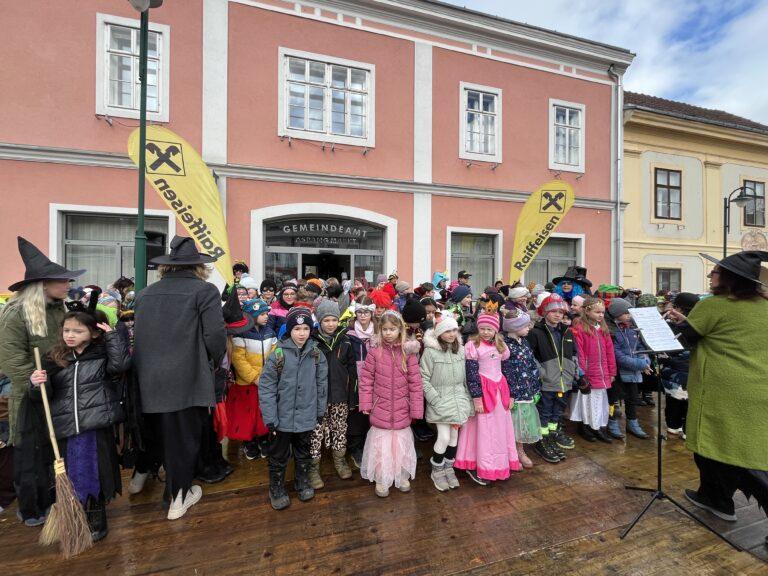 Mit kreativen Kostümen legten die Kinder einen fulminanten Auftritt am Hauptplatz hin. Der Hexentanz und Faschingssamba brachten gute Stimmung unters Publikum. Nach dem Auftritt wurden die Kinder mit einem Krapfen, gesponsert von der Raiffeisenbank Wiener Alpen, belohnt.