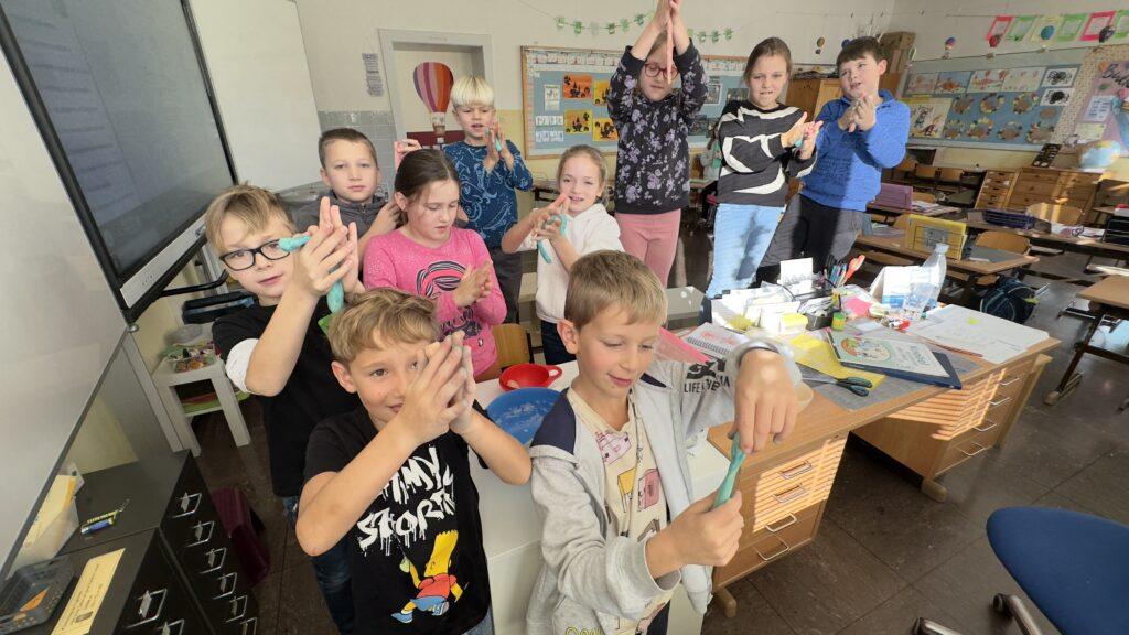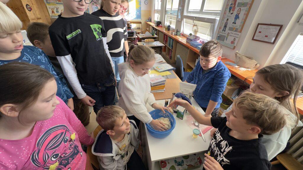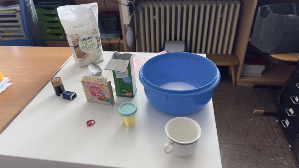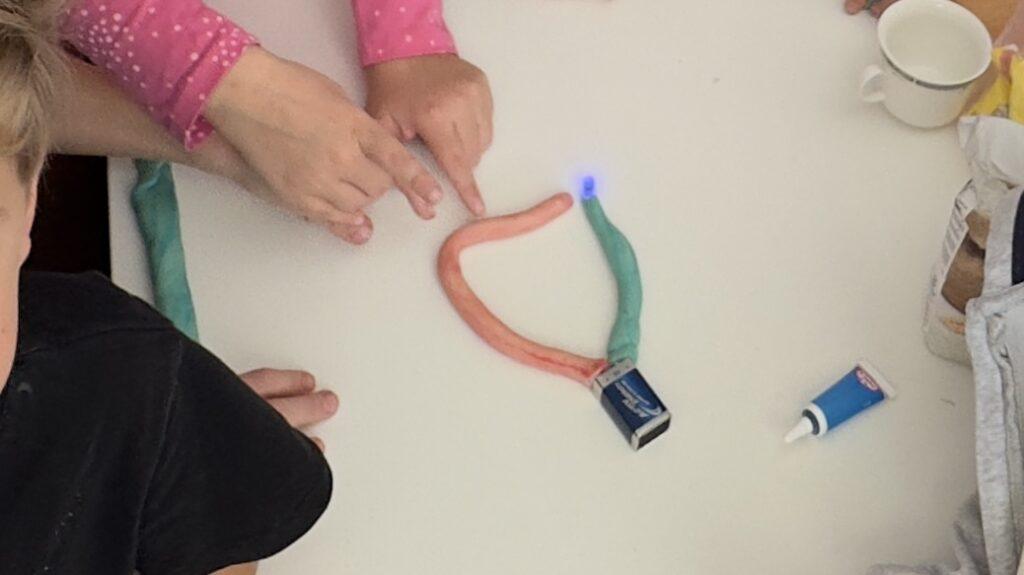 Die Kinder stellten ihre eigene Knete her und bauten einen Stromkreis auf. Die Überraschung: Ja, durch das Salz und die Zitronensäure im Teig kann der Strom durch die Knete fließen.
